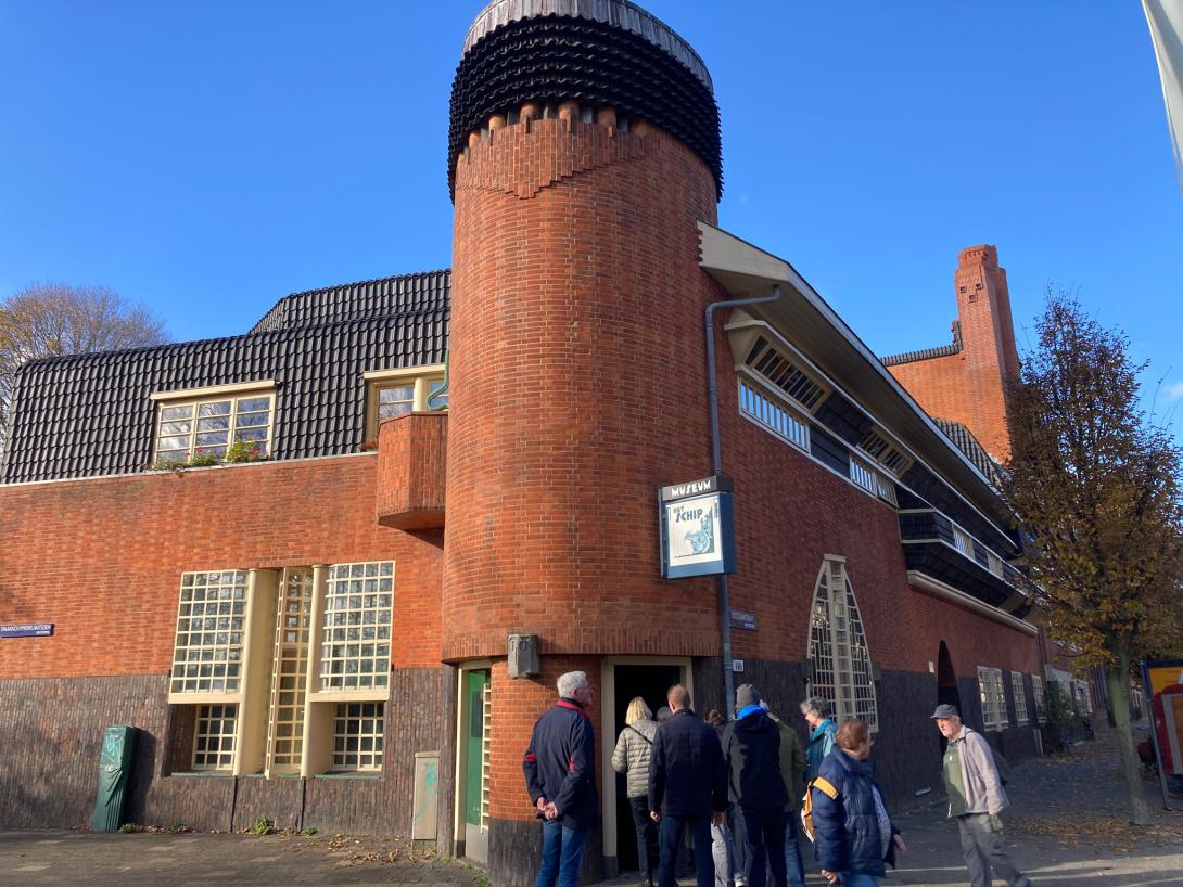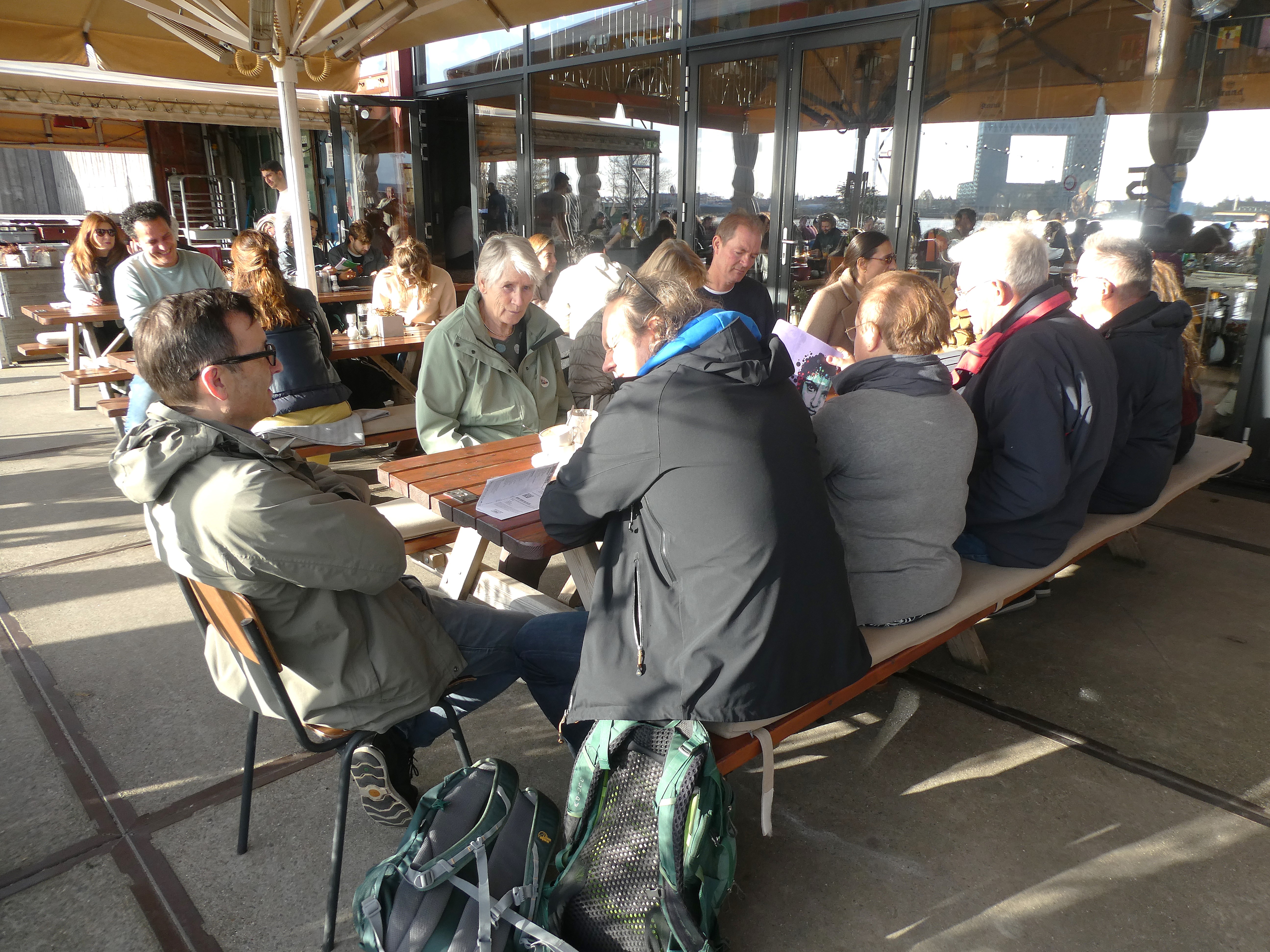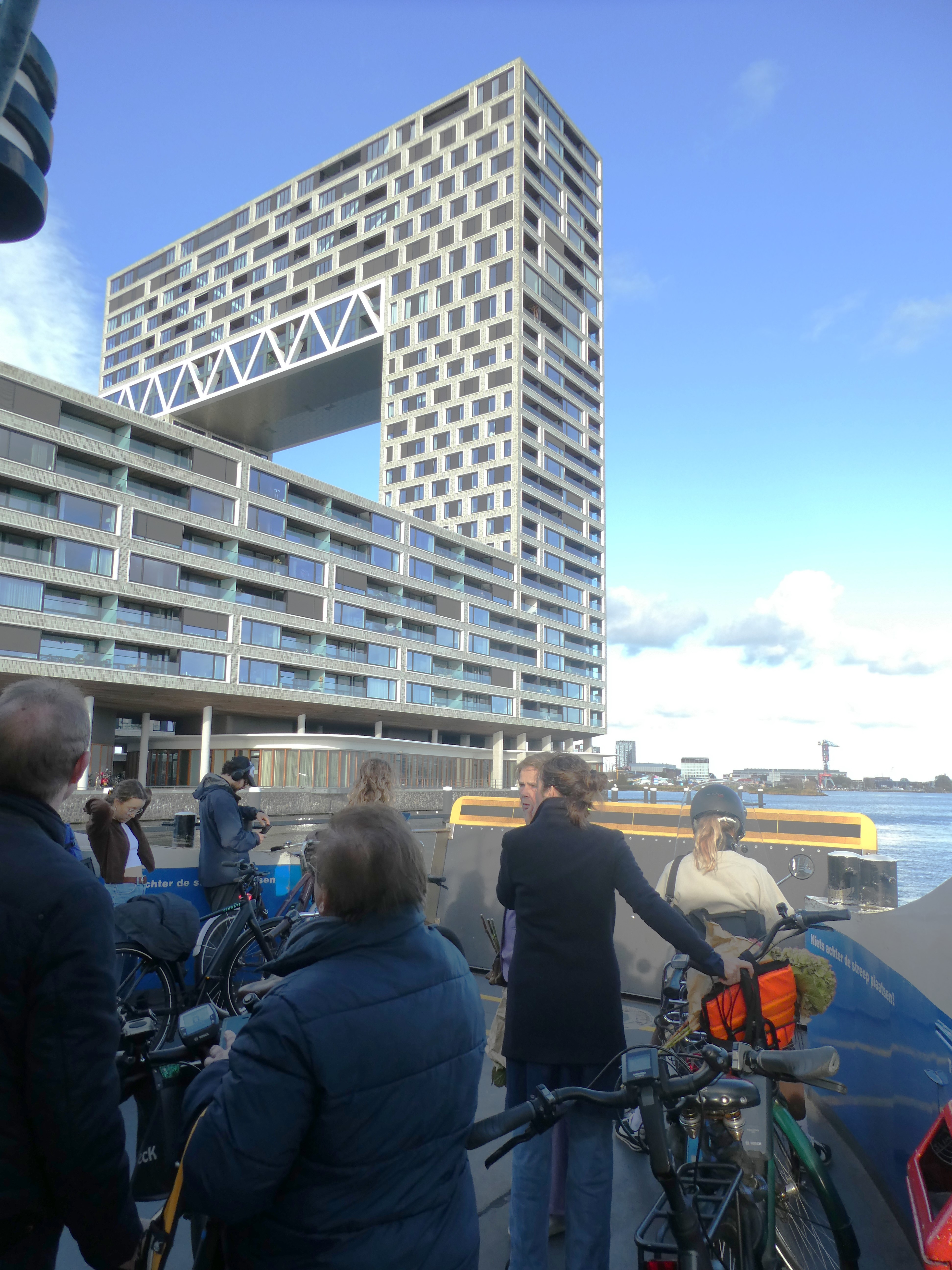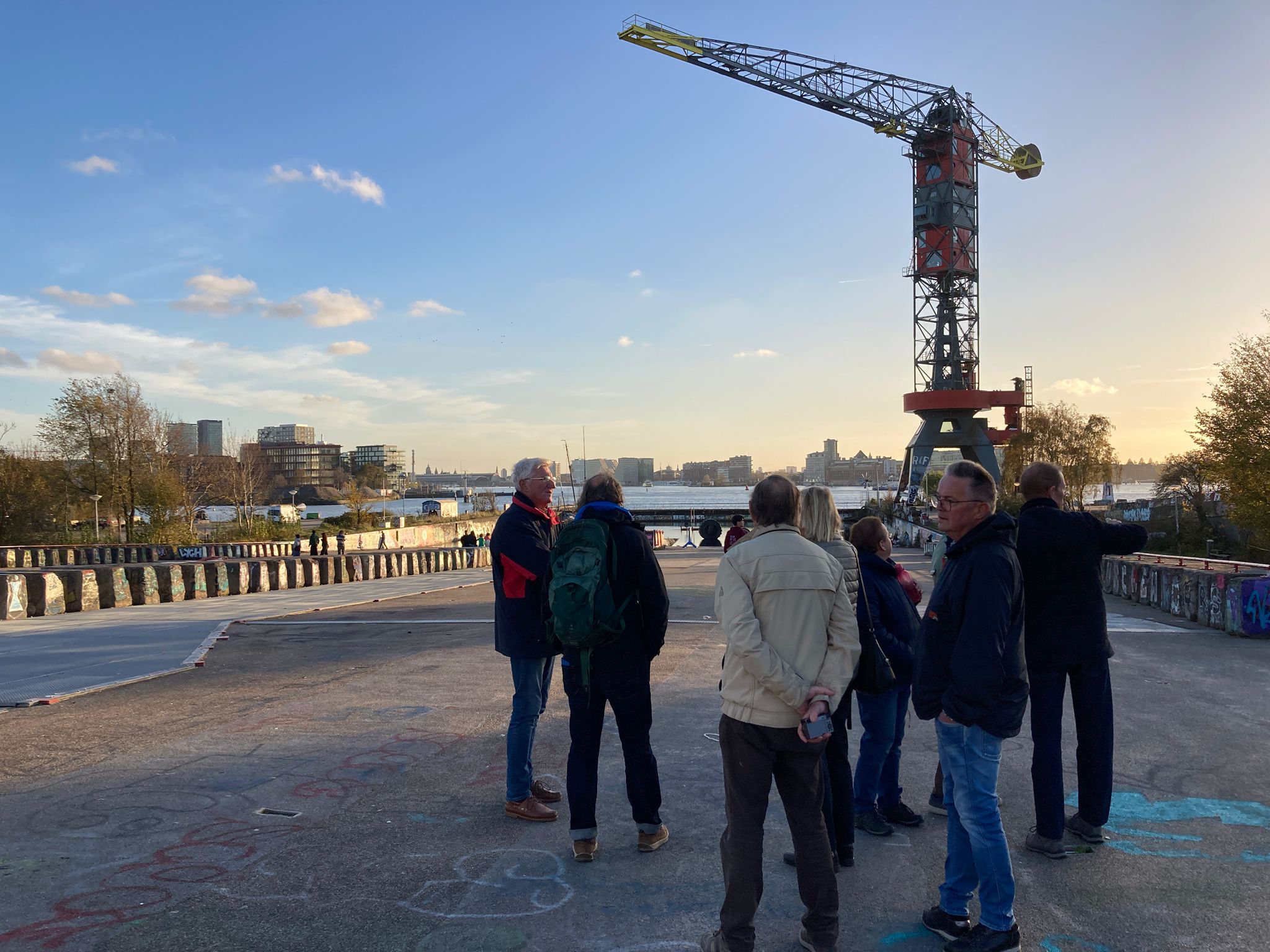 Na de veerpont over het IJ naar het KSNM-eiland zijn we over het JAVA-eiland gefietst en via de beroemde demontabele Jan Scheaferbrug (hij was weer open nadat het gedemonteerd was voor SAIL) naar het pakhuis de Zwijger gefietst. Langs het Centraal Station kwamen we uiteindelijk uit bij het museum Het Schip. Er zijn twee soorten mensen in Nederland, zij die nog nooit in dit museum zijn geweest en er geen voorstelling van kunnen maken (de naam is misleidend) en zij die het museum hebben bezocht en laaiend enthousiast zijn (en snappen waar de naam voor staat). Met name de rondleiding is erg bijzonder. Naast alle architecturale kenmerken zagen we ook het oude postkantoor. We werden we een flink eind terug in de tijd en in onze jeugdherinneringen geslingerd. Het museum leverde een serie mooie foto’s op en leuke gesprekken. In de middag zijn we met een veerpont weer het IJ overgestoken naar het dorp Buiksloterham. Via een korte tocht kwamen we uit op de NDSM werf. Bij Pllek (geen typefout) hebben we op een overvol terras in de zon heerlijk geluncht. We hebben de grote hallen van de voormalige werf bezocht en Jos Jager heeft ons de imposante hellingbaan laten zien.